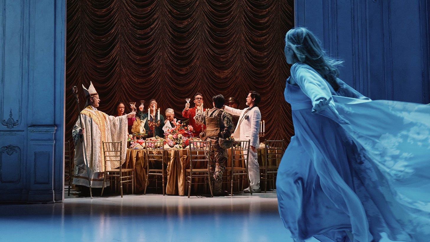 Early in the second act of Here We Are, a wealthy socialite named Marianne stands in an opulent embassy salon—the room that will soon become her prison—and sings a paean to surface beauty.